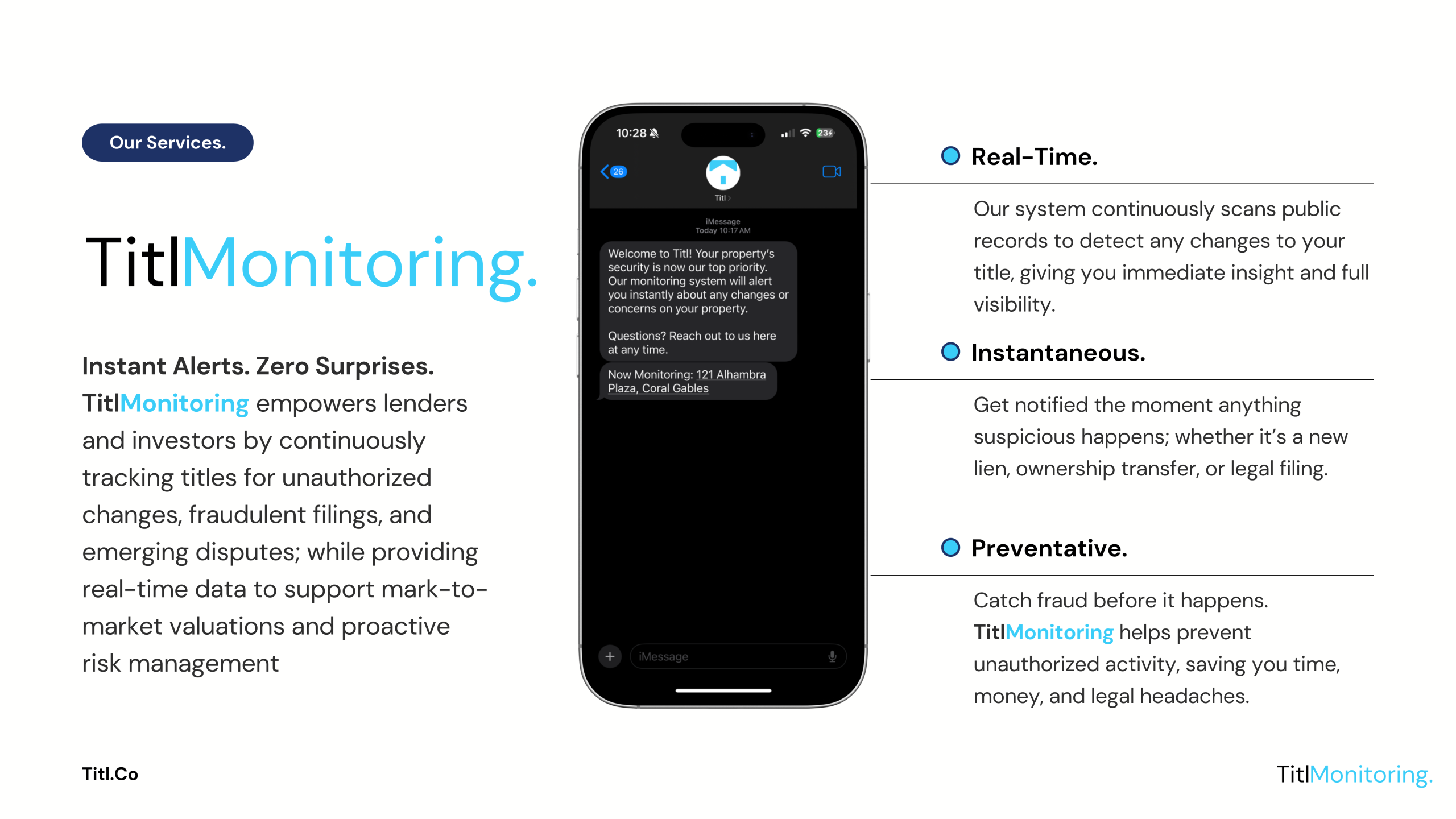 Titl is a tech-driven solution that prevents title fraud before it happens. Using blockchain, AI, and real-time monitoring, Titl provides instant title reports, fraud alerts, and transparent property data—empowering homeowners and real estate professionals to detect and stop fraud before it escalates.